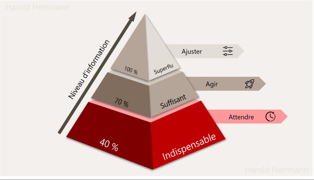 La règle 40/70 de Colin Powell montre qu’attendre la perfection peut être plus risqué que de prendre une décision bien informée mais imparfaite. Entre 40 et 70 % d’informations, on dispose du juste équilibre pour évaluer les risques, agir rapidement et rester agile face aux imprévus.